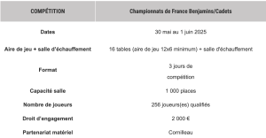 La Fédération française de tennis de table lance aujourd’hui un appel à candidatures pour l’organisation des championnats de France Benjamins-Cadets 2025. Cette compétition fédérale se déroulera du 30 mai au 1er juin 2025. Retrouvez l’ensemble des informations ci-dessous :