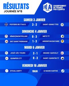Malgré la présence de Jianan Yuan (n°3), joueuse du mois de novembre et vainqueure de Prithika Pavade (n°5), Poitiers n’est pas parvenu à prendre le dessus sur les Dionysiennes, venues avec une équipe particulièrement solide. Toujours invaincue, la défenseuse néerlandaise a dominé ses adversaires du soir, Wu Jiaduo (n°17) puis Jianan Yuan (n°3). Agathe Avezou (n°65) a ensuite complété le score en s’imposant face à Claire Picard (n°66).